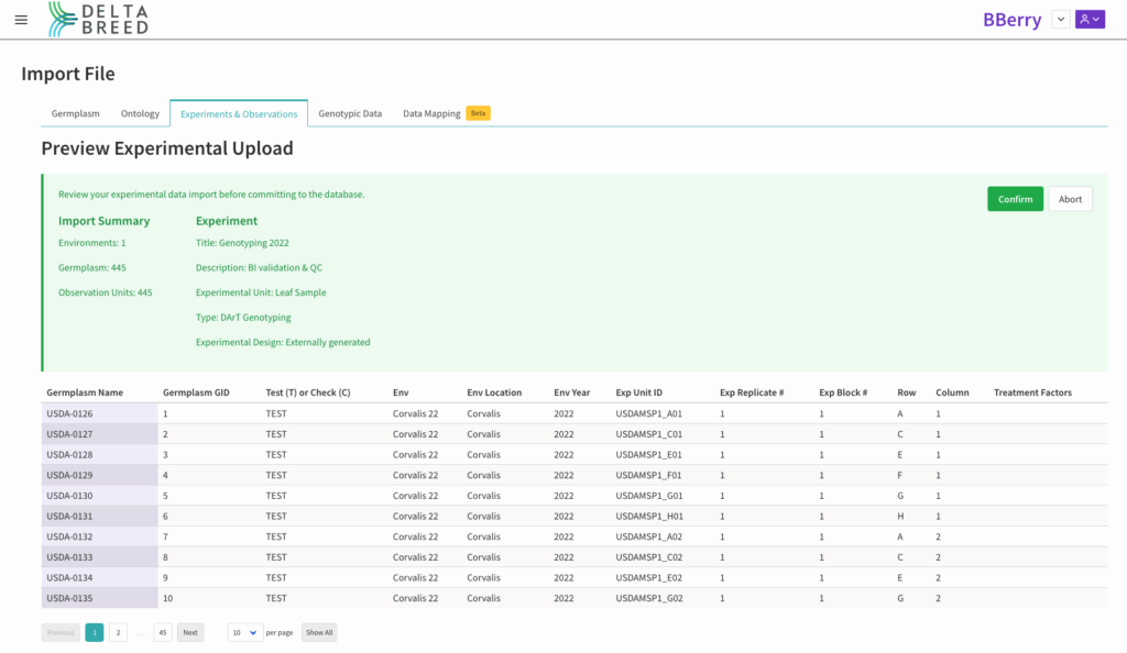 Genotyping data processed through Breeding Insight’s QC and validation pipeline in .vcf format can be loaded via the Import Data module. Select the Genotypic Data experiment and import. The Exp Unit IDs should match the sample ID in the .vcf file.